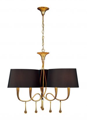 Mantra M0540/BS Paola Pendant 3 Arm 6 Light E14, Gold Painted With Black Shades & Amber Glass Droplets