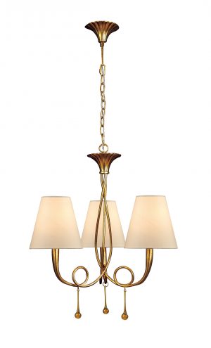 Mantra M0542 Paola Pendant 3 Light E14, Gold Painted With Cream Shades & Amber Glass Droplets