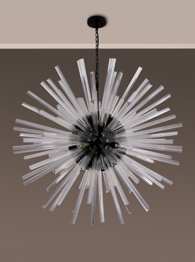 The Rigel Range presents intriguing glass shaped fittings that have been moulded to give a three dimensional triquetra. The glass rods on this range enhances the overall intriguing optical effect of the fittings and these can be further elevated by using modern LED light bulbs. The fixtures are available in a variety of finishes and sizes from semi-flush fittings to 32 light pendants. Each frame can be chosen with either a brown oxide, polished nickel or matt black frame with either clear, champagne gold or smoke glass.