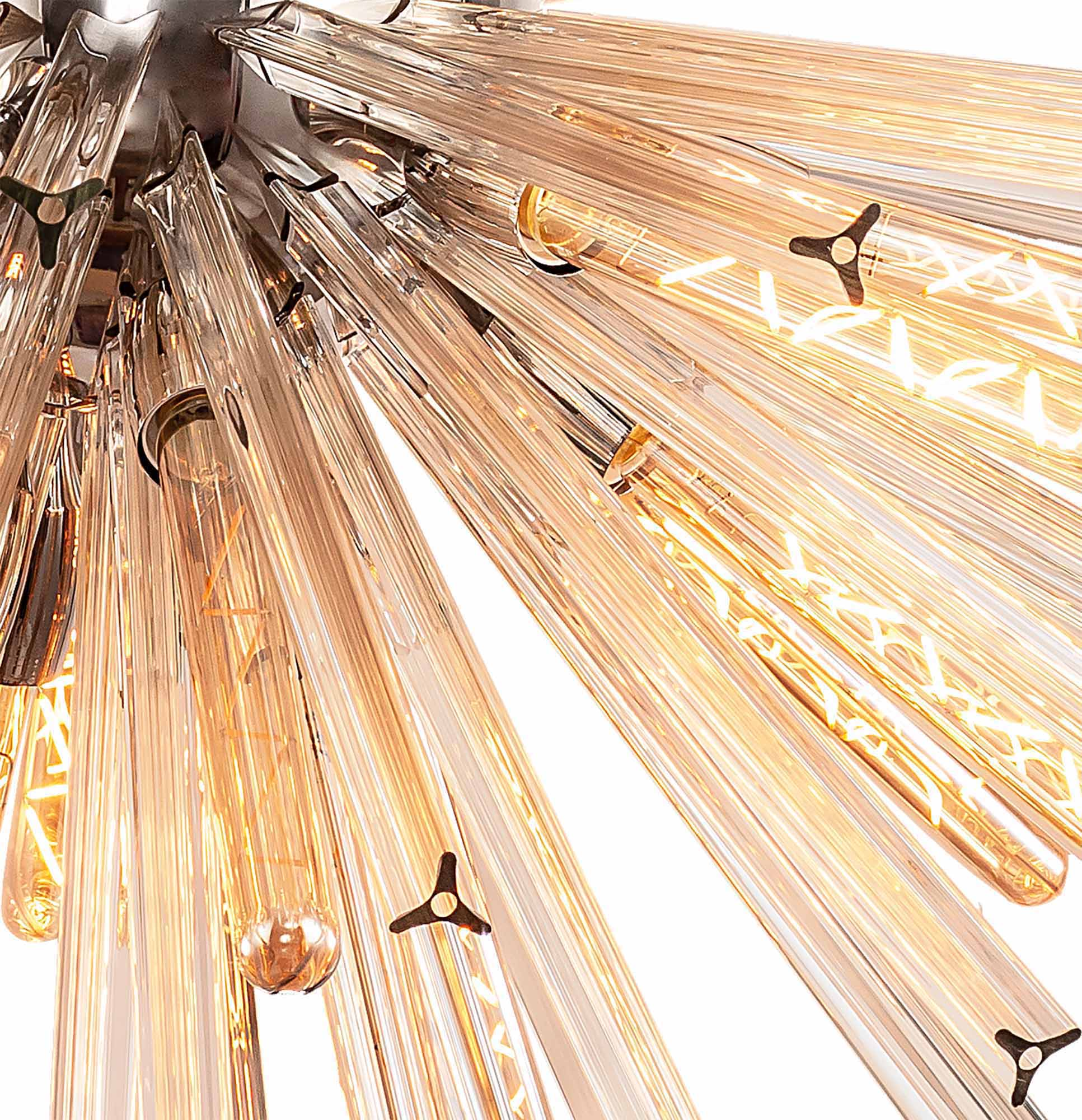 The Rigel Range presents intriguing glass shaped fittings that have been moulded to give a three dimensional triquetra. The glass rods on this range enhances the overall intriguing optical effect of the fittings and these can be further elevated by using modern LED light bulbs. The fixtures are available in a variety of finishes and sizes from semi-flush fittings to 32 light pendants. Each frame can be chosen with either a brown oxide, polished nickel or matt black frame with either clear, champagne gold or smoke glass.