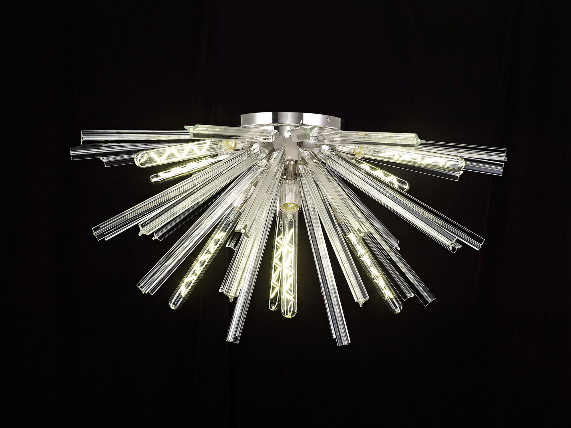 The Rigel Range presents intriguing glass shaped fittings that have been moulded to give a three dimensional triquetra. The glass rods on this range enhances the overall intriguing optical effect of the fittings and these can be further elevated by using modern LED light bulbs. The fixtures are available in a variety of finishes and sizes from semi-flush fittings to 32 light pendants. Each frame can be chosen with either a brown oxide, polished nickel or matt black frame with either clear, champagne gold or smoke glass.