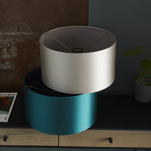 A simple cylinder drum shade in Mink satin fabric. This shade is a perfect compliment to the Artisan collection of hand blown glass table lamps.