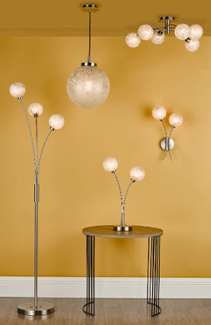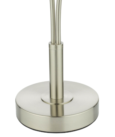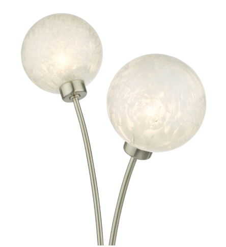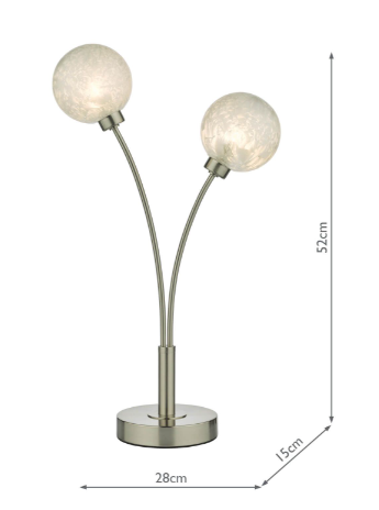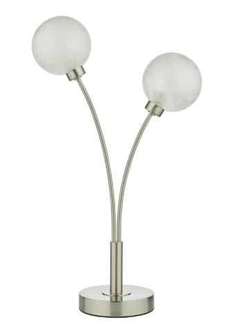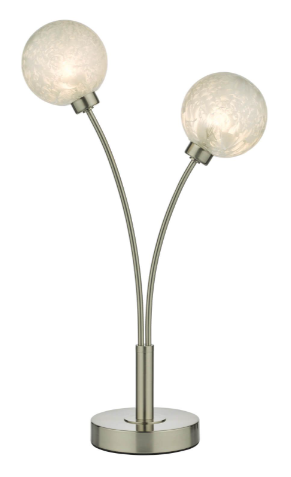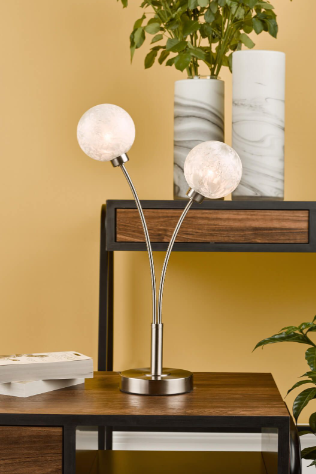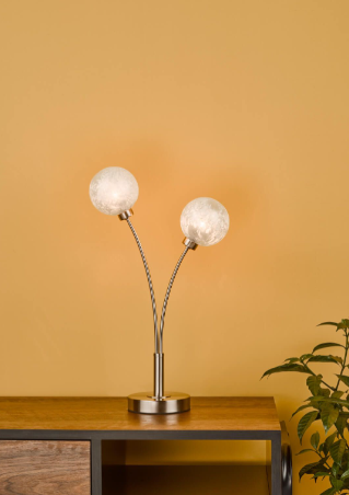 The AVARI 2 light table lamp features a frost effect glass shade and a satin nickel finish. This table lamp is ideal for positioning next to a sofa or bedside table since the frosted glass gently diffuses the light.