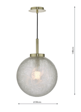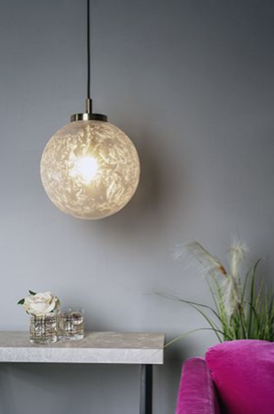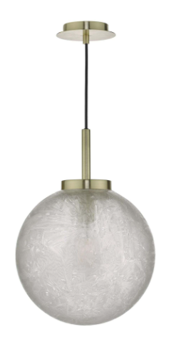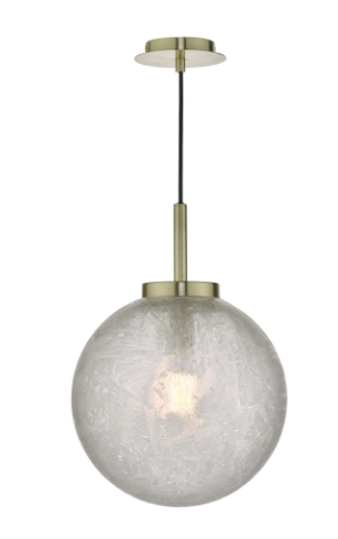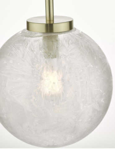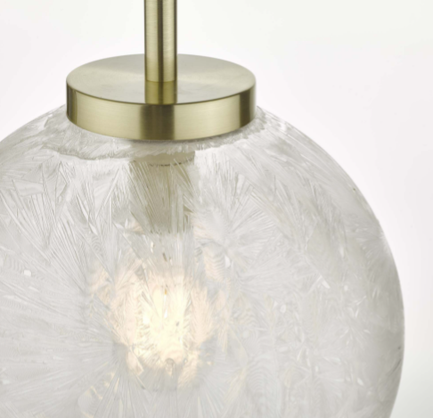 The acid dipped glass shade of the Avari single pendant creates the appearance of ice crystal spheres. This fitting, which has a satin brass finish, would look elegant in any space.