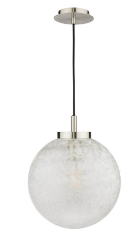 The acid dipped glass shade of the Avari single pendant creates the appearance of ice crystal spheres. This fitting, which has a satin nickel finish, would look elegant in any space.