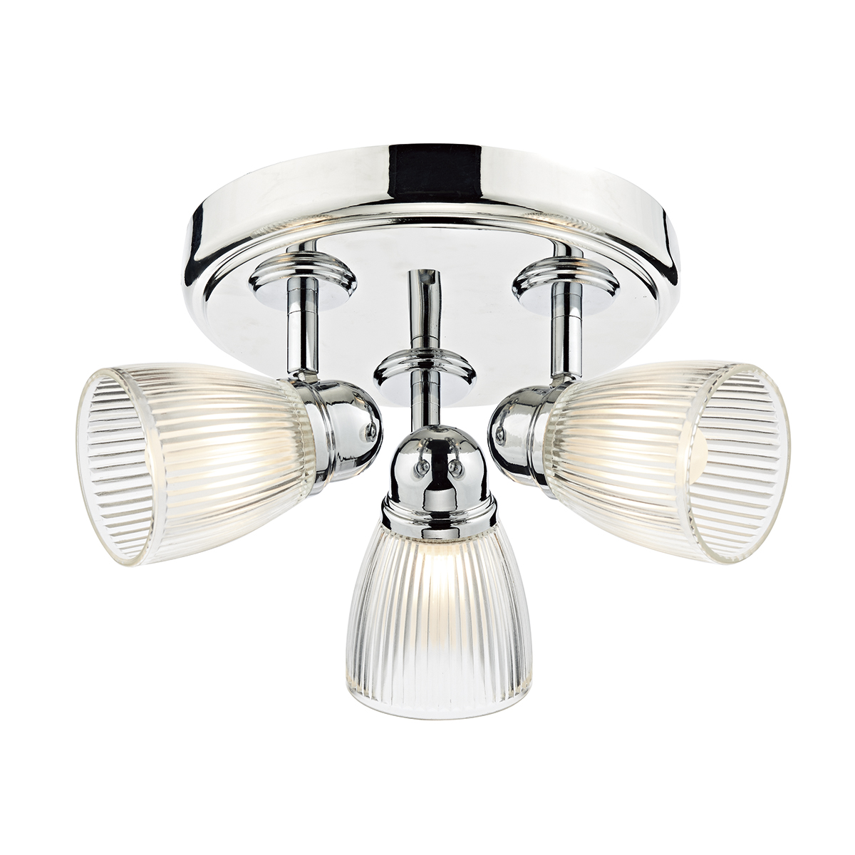 A 3 light round plate fitting in a polished chrome finish, featuring ribbed glass shades. IP44 rated so suitable for bathroom use. A matching single wall bracket is also available.
