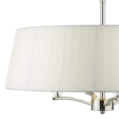 A 4 light pendant in a polished nickel finish, featuring an ivory ribbon shade. Supplied with 1 meter of chain, height adjustable at the point of installation. Also available with a navy shade.
