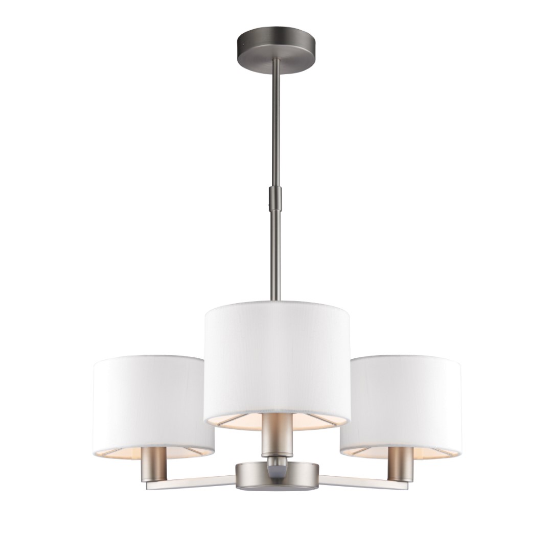An understated modern 3 arm pendant, mixing a subtle matt nickel plated finish with timeless vintage white faux silk shades. Modern styling for today’s interiors. Matching items also available.