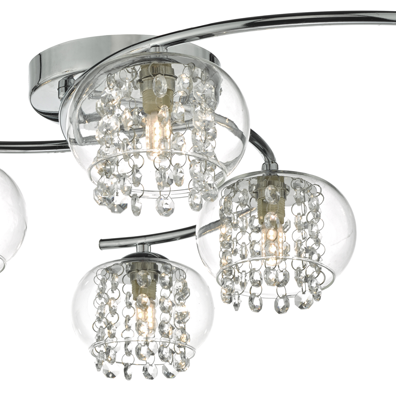 A 6 light semi flush fitting in a polished chrome finish. Featuring strings of crystal glass beads encased in a clear glass shade. Ideal in spaces where ceiling height is limited. Also available in this range is a 4 light semi flush and a single wall bracket.