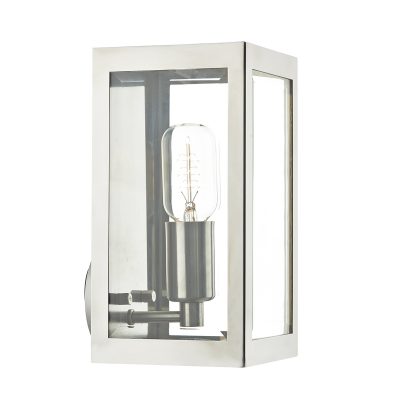A modern wall bracket in a stainless steel finish, featuring clear glass panels in a box style frame. IP44 rated so suitable for outdoor use. Also available in black.