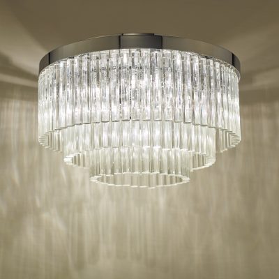 A semi- flush ceiling light in a polished chrome finish. Featuring three tiers of clear crystal rods, a modern take on a traditional style chandelier. Suspended by three steel wires, height adjustable at the point of installation.
