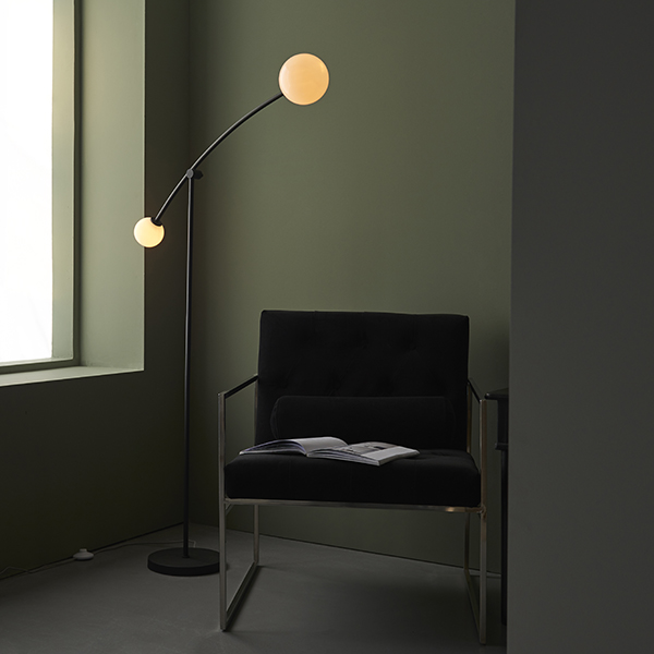 The asymmetric 4 light pendant creates a real illusion of balance, whilst the floor lamp has added interest with twin globes at either end of the arm.