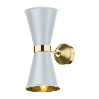 A contemporary, mid-century style double wall bracket featuring an arctic white shade and solid brass detailing.