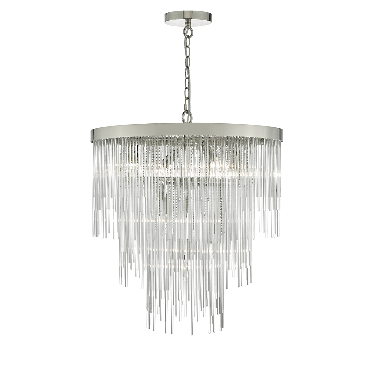 A stunning 7 light pendant in a polished chrome finish. Featuring 380 glass rods making up 3 tiers, forming a waterfall style. Supplied with 2 meters of chain, height adjustable at the point of installation.