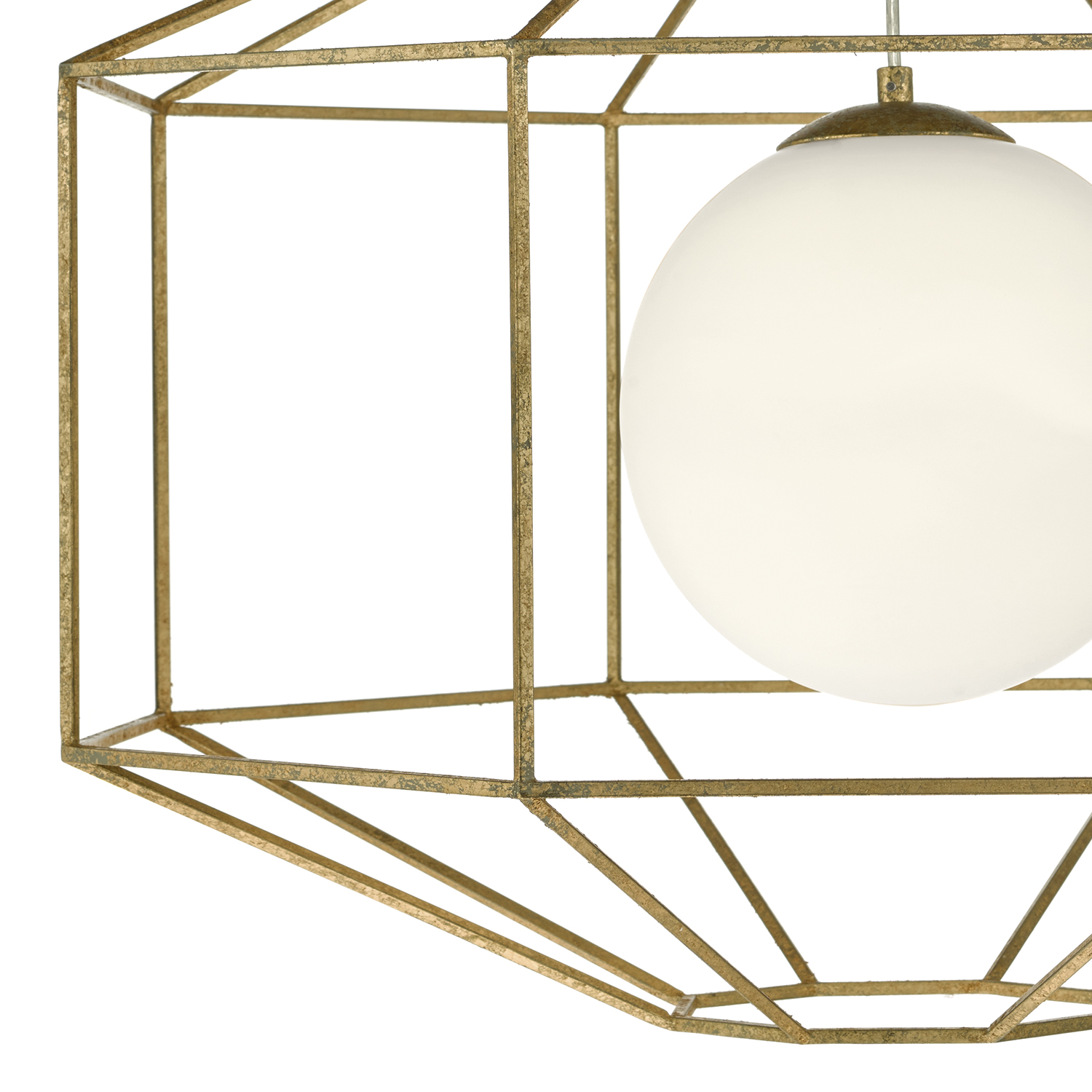 A mid century style single pendant in an old gold finish. A geometric frame encases an opal glass globe. Height adjustable at the point of installation.