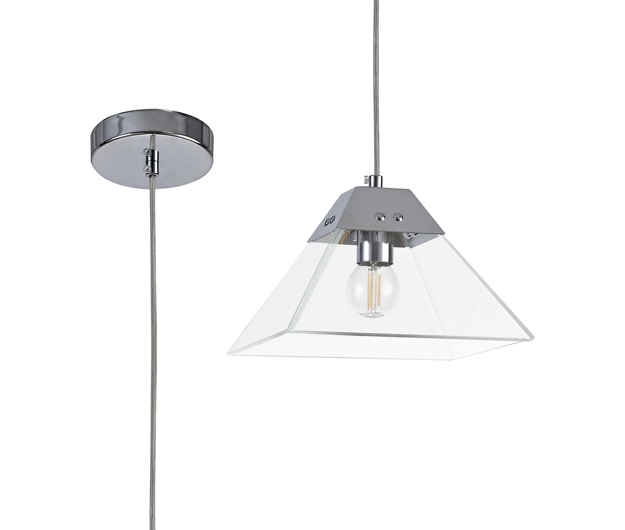 Janco utilises the maximum output possible for the chosen E14 or E14 lamp, by transferring the traditional pyramid shape of fabric shades onto a transparent material. The open glass forms not only allow a wider projection of light from the open space but also permit a more overall ambient dispersion of light through the clear glass sides. The wall lamps within this collection are particularly prominent with the trapezium plate reflecting the lines of the glass housing. Both the single pendants and wall lamps are available in either a polished chrome or antique brass colour finish.