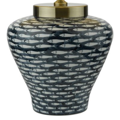 A charming table lamp featuring white fish motif on a blue background. Operated by an in line rocker switch. Base only, shade to be purchased separately.