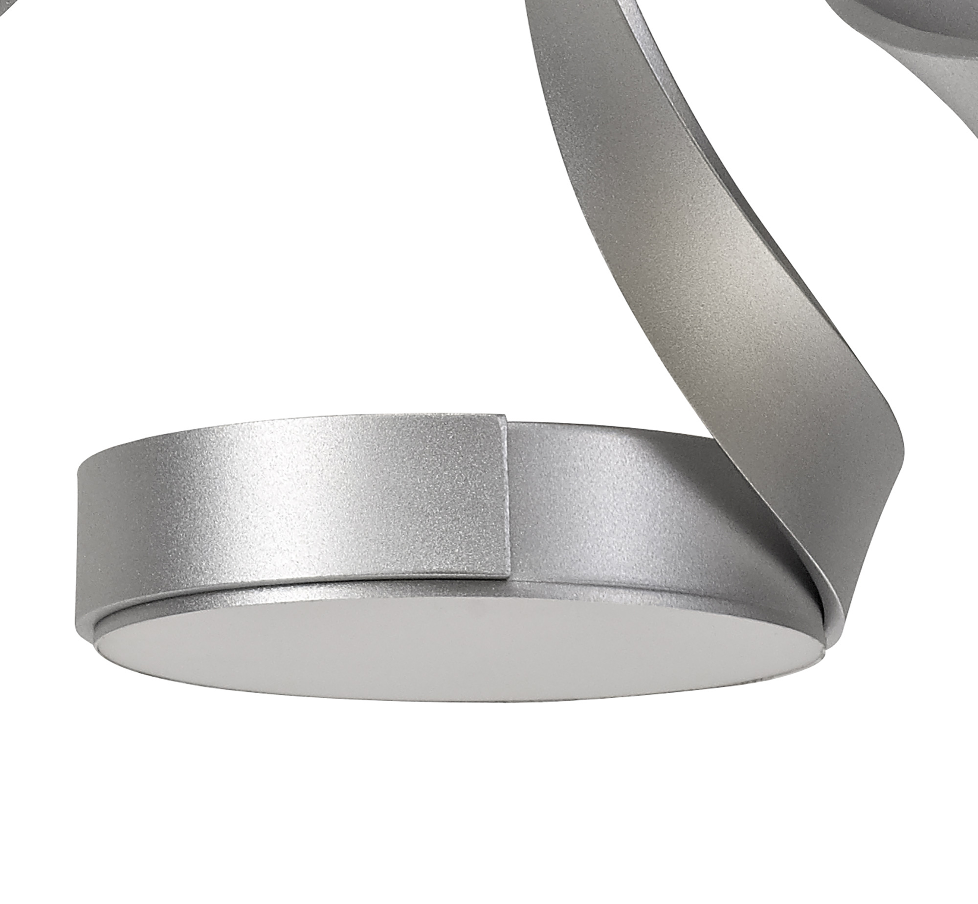 Kandi presents silver framework manipulated to reflect lengths of ribbon which twist into a ring at the end. These rings encircle the round diffuser disk that houses the integral 3000K LED’s. The flat disk surface dispels the optimum amount of light possible to ensure there is no waste from the high wattage LED’s. The switched wall lights are available in both a left and right version, along with the table lamp and semi ceiling light, the fixing plates are also round in keeping with the rest of the fixture.