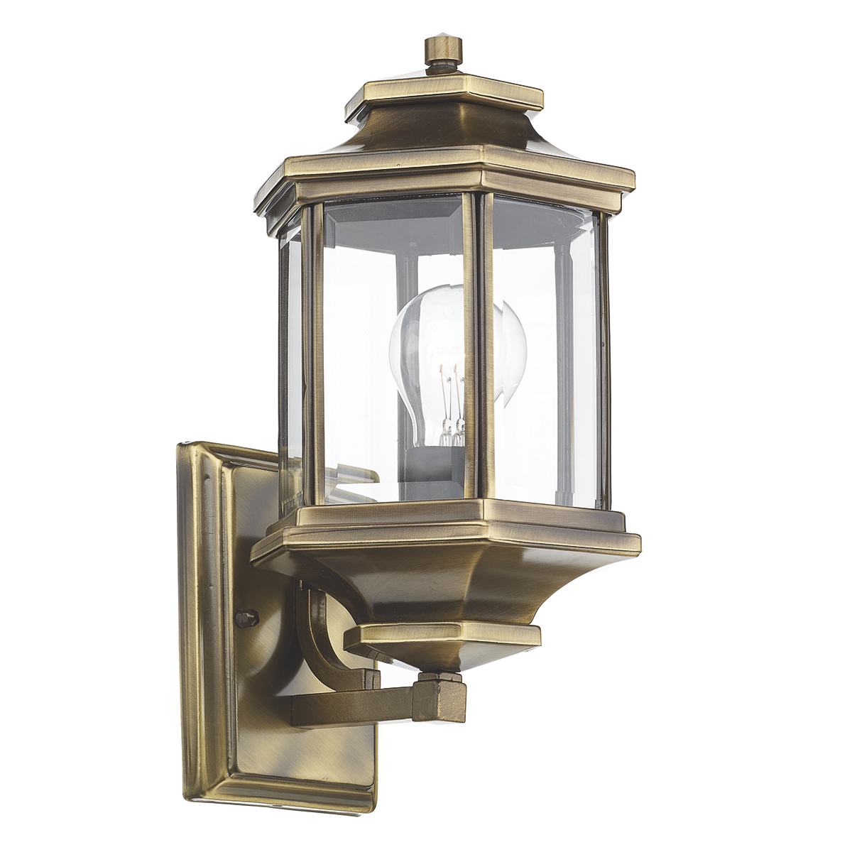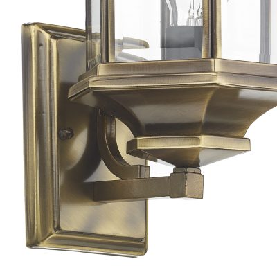 A traditional style wall bracket in an antique brass finish. Featuring bevelled glass panels and modern style lamp holder. IP44 rated so suitable for outdoor use.