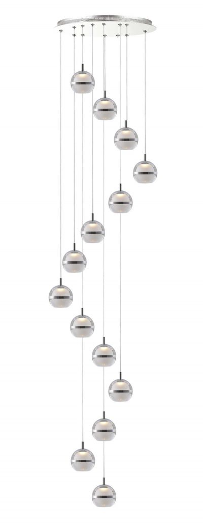 The Latitude collection has taken pride of place in our showroom since August 2017 and remains one of our best selling ranges of all time. Customers are attracted by it’s simple timelessness and visually interesting appeal in equal measure. The high density clear acrylic spheres are internally hollowed and frosted producing an orb within an orb appearance. The spheres are a attached to a slender poliched chrome cap which houses the warm white replaceable LED modules.With ultra fine cables which can be raised or lowered via a simple clutch mechanism, it’s also an easy range to live with. With a small single pendant all the way to a very large 20 light pendant this versatile range has something for everyone. This is the Latitude 14 Light LED Round Pendant.