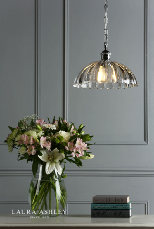 The Salisbury is a timeless ceiling light with a polished chrome suspension and clear ribbed glass in a shallow dome shape.