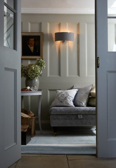 The Laura Ashley Sorrento wall bracket boasts 2 lights on the arms, all contained in a single contemporary charcoal demi drum shade with a metallic silver inner.  Available in a variety of finishes, adding sophisticated atmosphere to your living area.