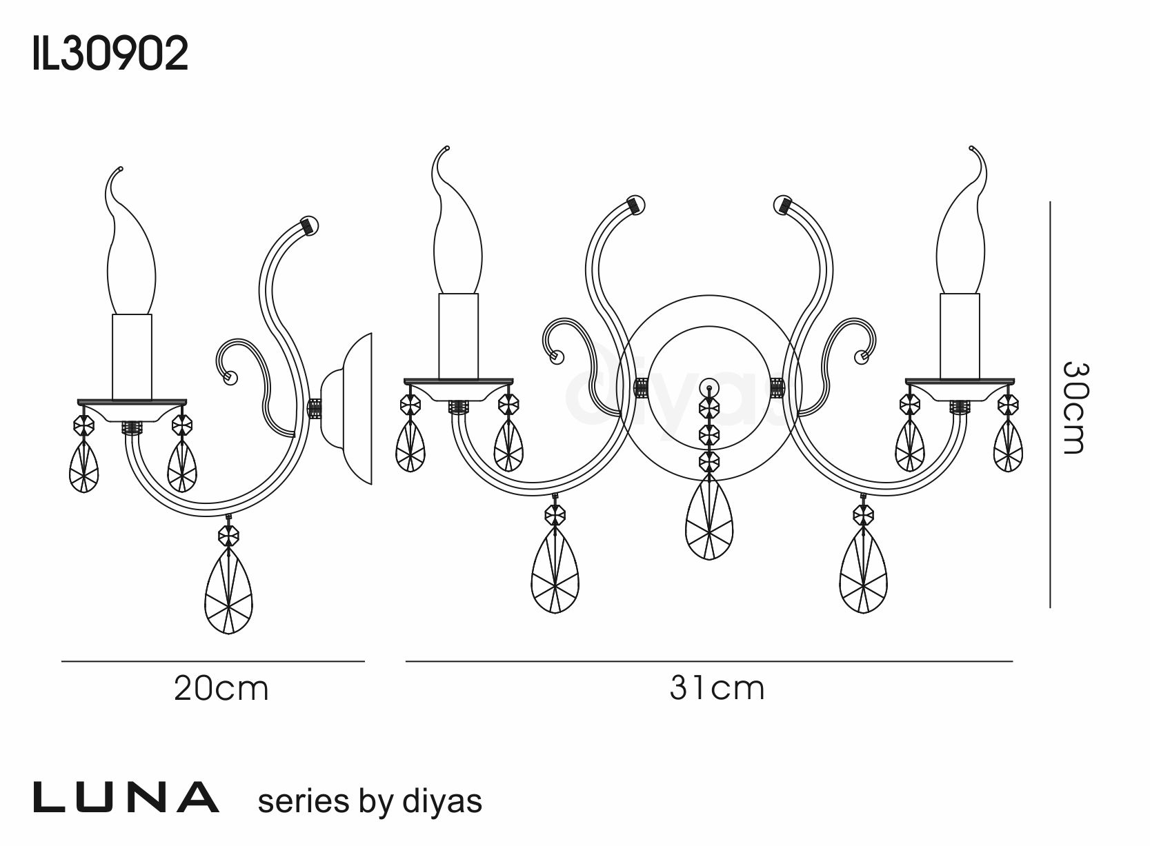 Luna Wall Lamp 2 Light Black Chrome/Crystal