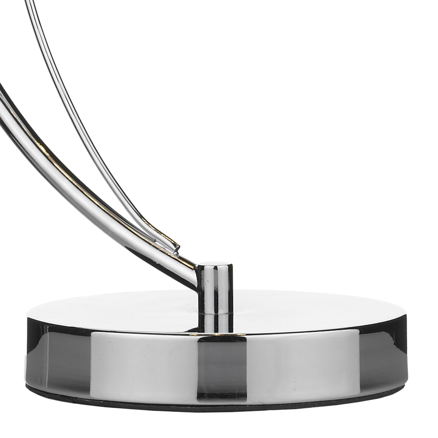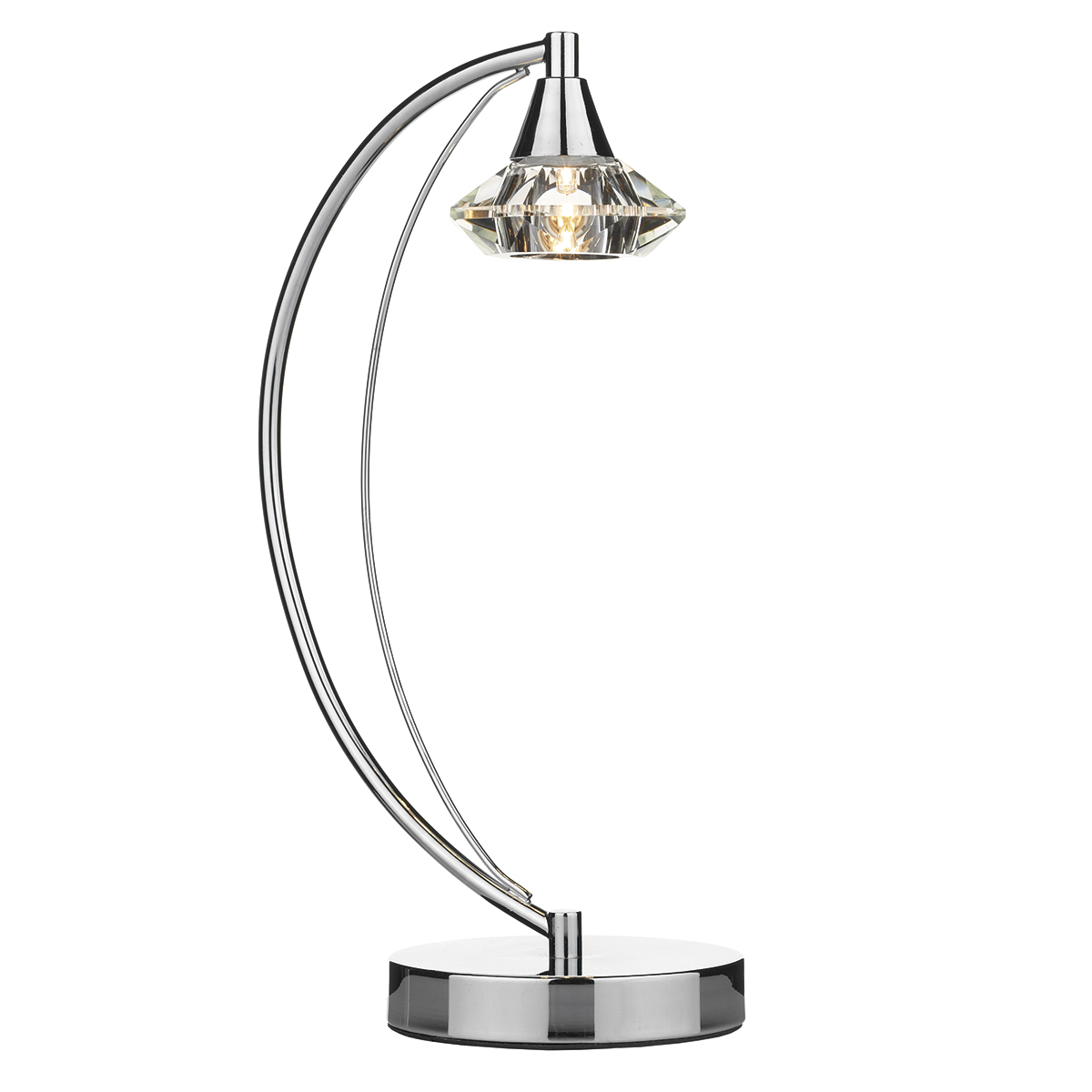 A contemporary table lamp in a polished chrome finish. Complete with a faceted crystal glass shade. Operated by an in line rocker switch. Also available in satin chrome, black chrome and antique brass.