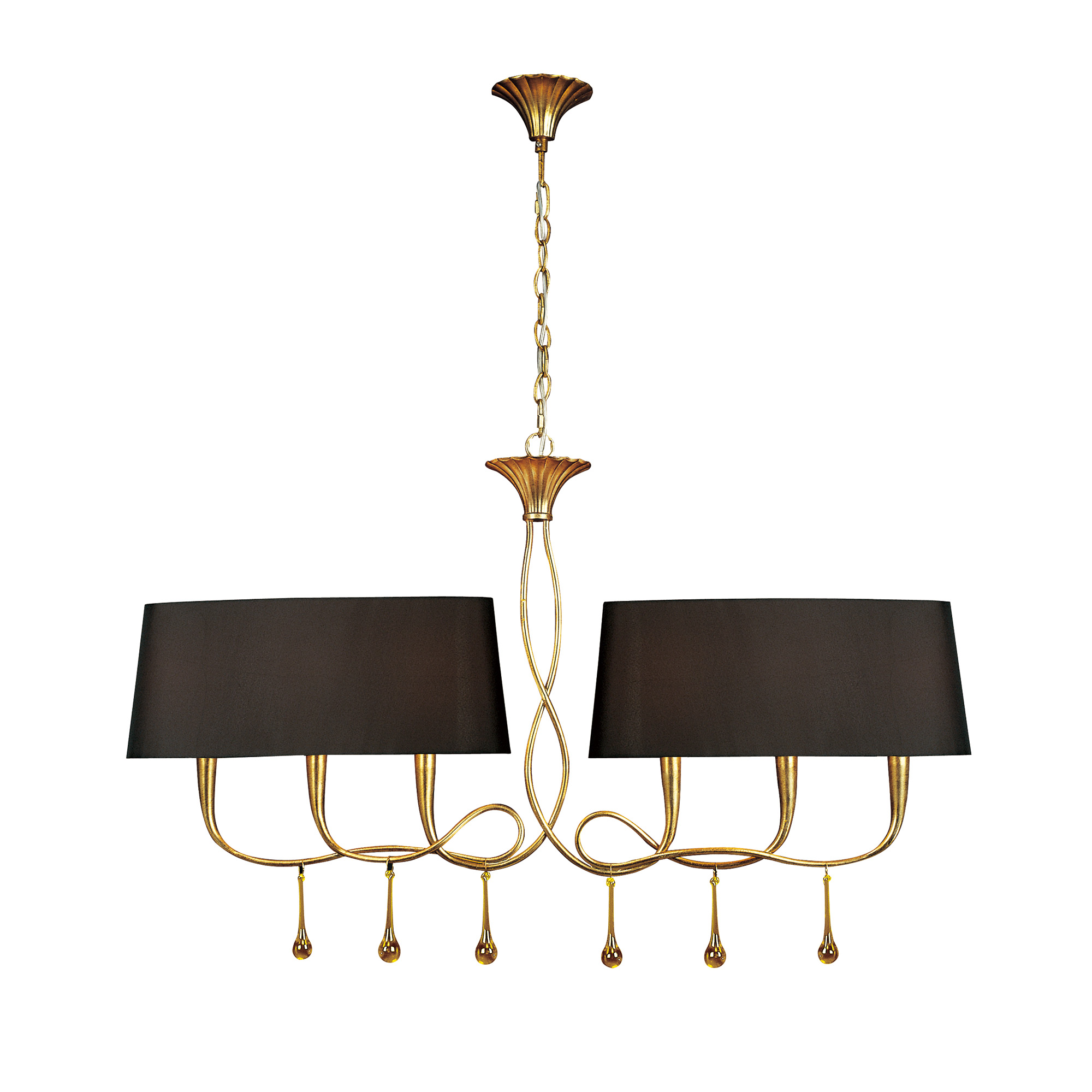 Mantra M0541/BS Paola Pendant 2 Arm 6 Light E14, Gold Painted With Black Shades & Amber Glass Droplets
