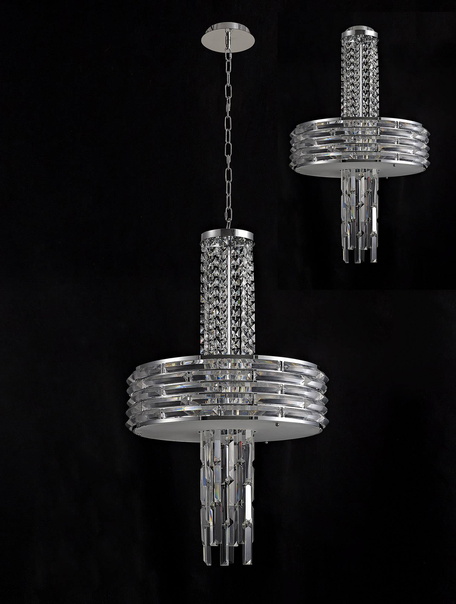 Martha is an exquisite crystal fixture combining a variety of different high quality crystal components to amplify its distinctive presence. This ultra-modern creation begins with a waterfall of square crystal pieces stopping at the wider, originally formed frame with curved rows of long slim rectangular crystals inserted into minimalistic polished chrome metalwork. This section conceals the E14 lampholders which can take a maximum of 40W. The cascading crystals resume beneath the frosted diffuser transforming from square pieces into more substantial rectangular crystals. Martha’s intricate facets make a fascinating crystal pendant which can be converted into a semi ceiling light if required.