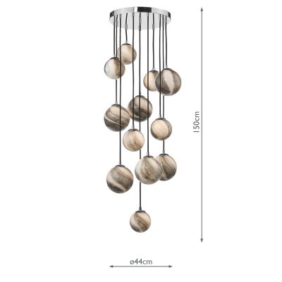 A statement cluster pendant consisting of 12 small planet style glass shades with varying sizes. The frame is polished chrome and is supplied with black braided cable which can be adjusted pre installation. Matching items also available.