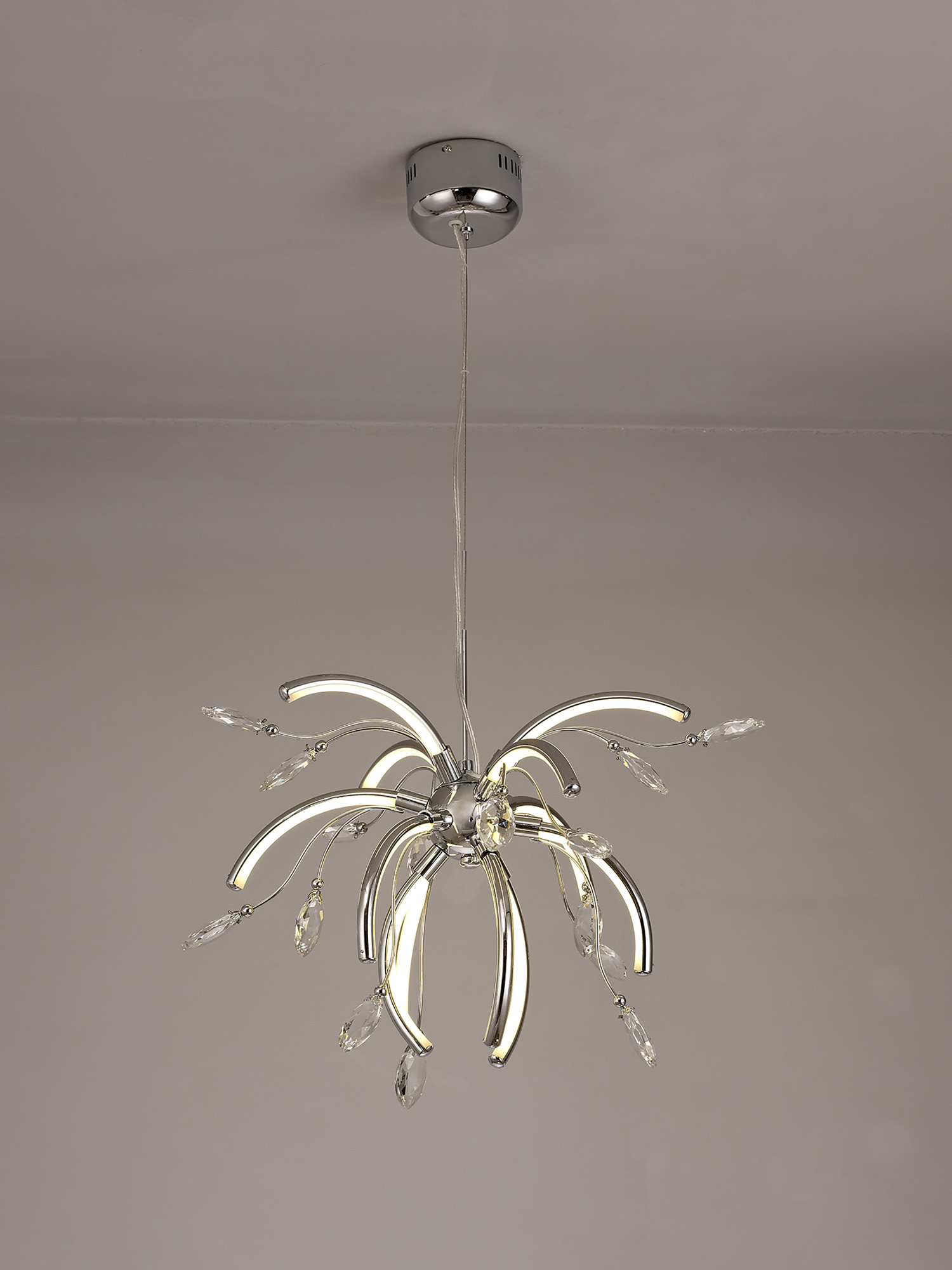Mina breaks away from the common methods of displaying integral LED lighting which have now become the norm for modern designs. The warm light from the LED’s are reflected throughout the fitting as a whole, diffused along the curved chrome arms protruding from the ceiling plate. The curvature of these arms first sending the light in an outwards direction then begins to throw the light at an upward angle. This ensures the leaf shaped clear crystals, fixed to the ends of the polished chrome waved stems, are enhanced by the LED light to produce a dazzling effect. With various lighting options available, Mina’s sophisticated elegance is striking even when unlit.
