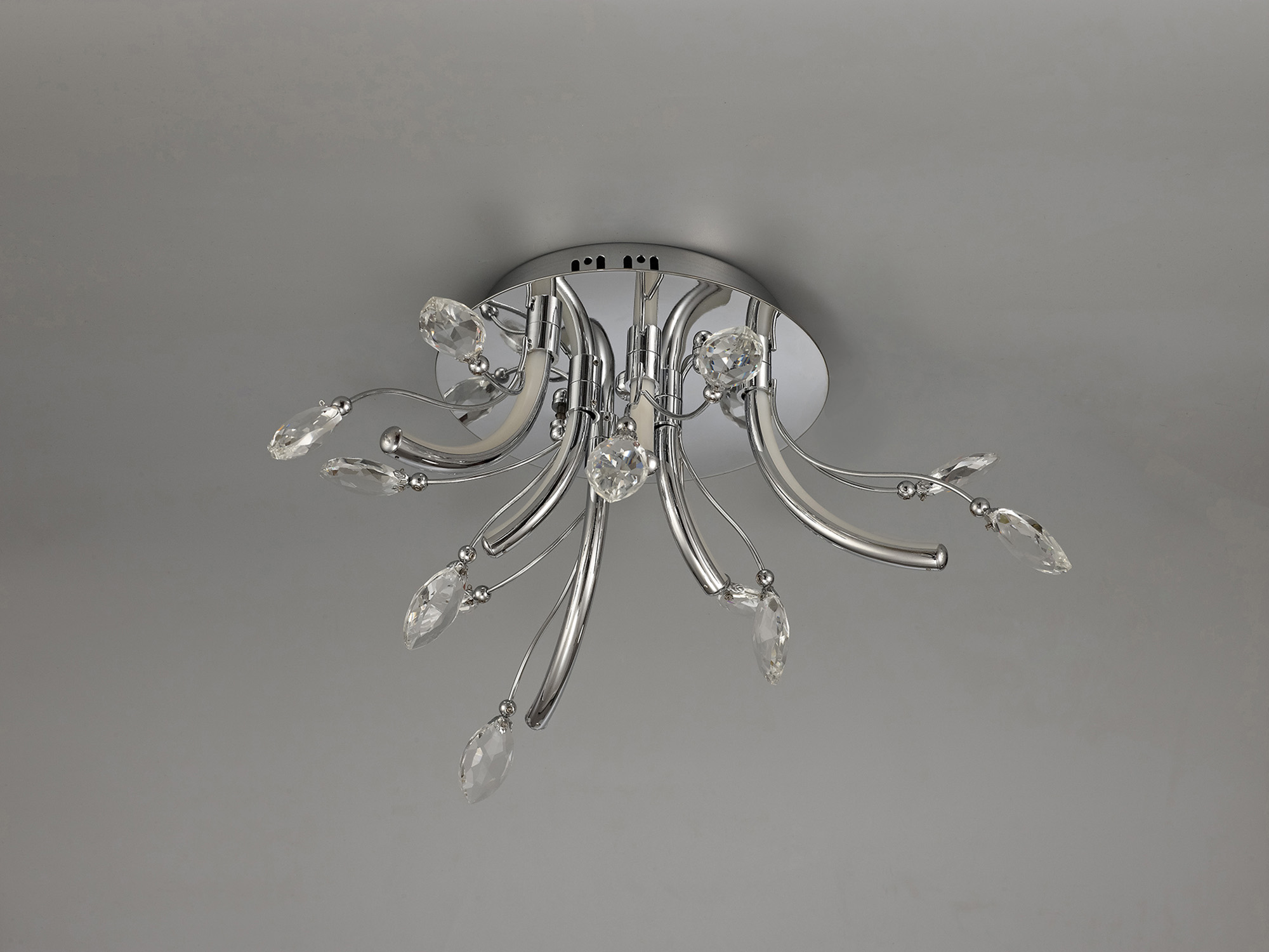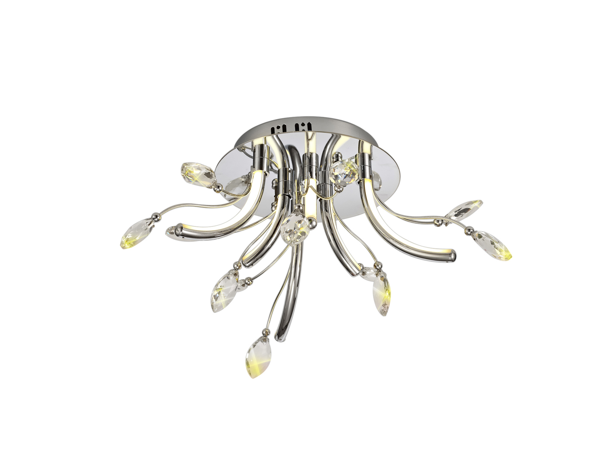 Mina breaks away from the common methods of displaying integral LED lighting which have now become the norm for modern designs. The warm light from the LED’s are reflected throughout the fitting as a whole, diffused along the curved chrome arms protruding from the ceiling plate. The curvature of these arms first sending the light in an outwards direction then begins to throw the light at an upward angle. This ensures the leaf shaped clear crystals, fixed to the ends of the polished chrome waved stems, are enhanced by the LED light to produce a dazzling effect. With various lighting options available, Mina’s sophisticated elegance is striking even when unlit.