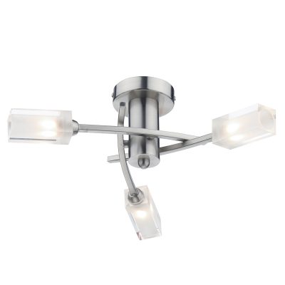 A 3 light semi flush fitting in a satin chrome finish. A satin chrome frame holds three rectangular glass shades with frosted inner glass. Also available in this range is a 6 light semi flush, double wall bracket, table lamp and floor stand. Also available in polished chrome, black chrome and antique brass.