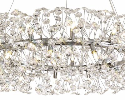 The beautiful 26 Light Voltaire Pendant uses slim stems angled erratically to form an enchanting cluster of clear crystal disks. The lines of the central framework act as a base from which the crystals can sit around the G9 lampholders ensuring the light emitted from the lamp refracts through each facette throwing sublime spectrums. Available in polished chrome and french gold in a number of configurations.