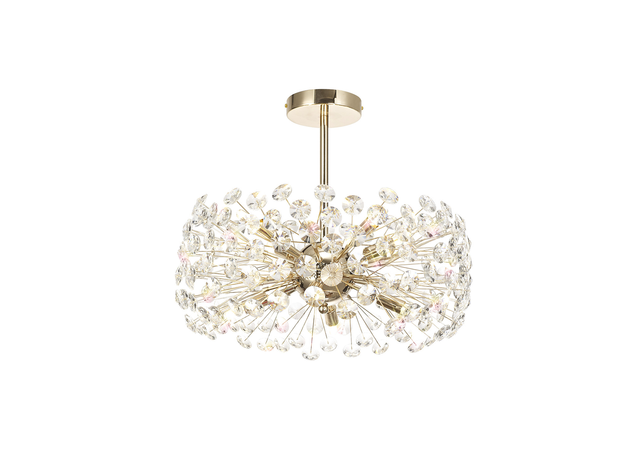 The beautiful 8 Light Voltaire Semi Flush uses slim stems angled erratically to form an enchanting cluster of clear crystal disks. The lines of the central framework act as a base from which the crystals can sit around the G9 lampholders ensuring the light emitted from the lamp refracts through each facette throwing sublime spectrums. Available in polished chrome and french gold in a number of configurations.