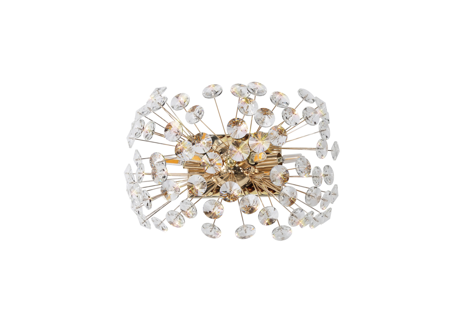 The beautiful 4 Light Voltaire Wall Bracket uses slim stems angled erratically to form an enchanting cluster of clear crystal disks. The lines of the central framework act as a base from which the crystals can sit around the G9 lampholders ensuring the light emitted from the lamp refracts through each facette throwing sublime spectrums. Available in polished chrome and french gold in a number of configurations.