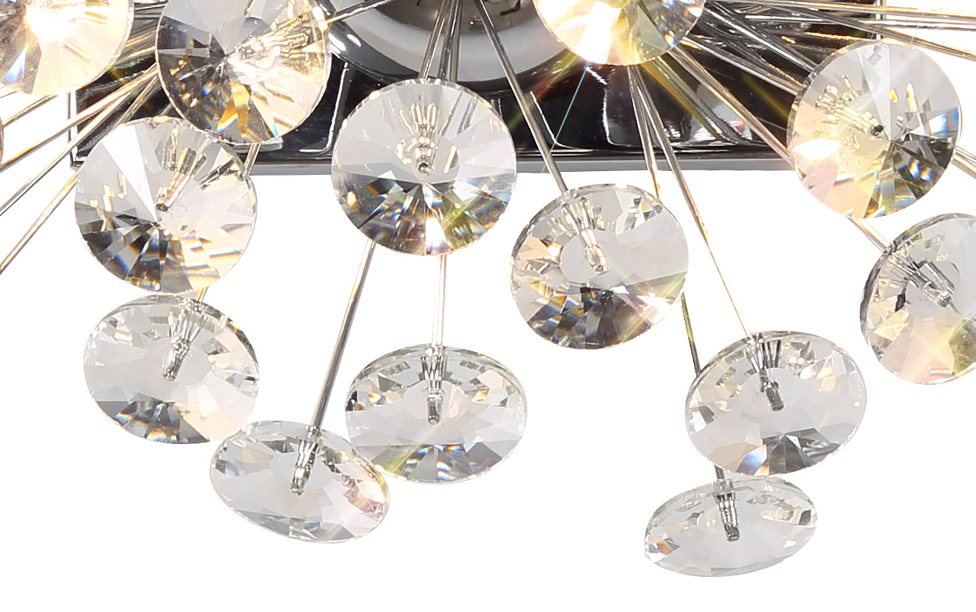 The beautiful 4 Light Voltaire Wall Bracket uses slim stems angled erratically to form an enchanting cluster of clear crystal disks. The lines of the central framework act as a base from which the crystals can sit around the G9 lampholders ensuring the light emitted from the lamp refracts through each facette throwing sublime spectrums. Available in polished chrome and french gold in a number of configurations.