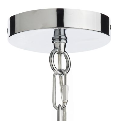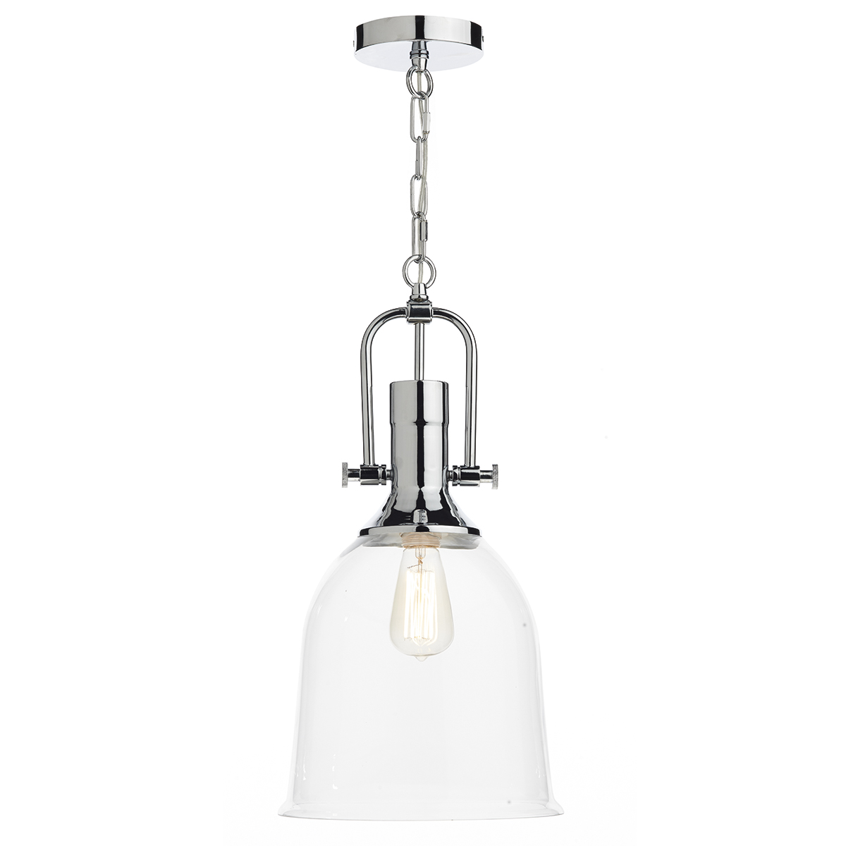 A single industrial style pendant in a polished chrome finish. Featuring a bell shaped clear glass shade with chrome chain and ceiling plate. Comes supplied with 100cm of chain and cable, height adjustable at the point of installation. Also available in a polished chrome finish.