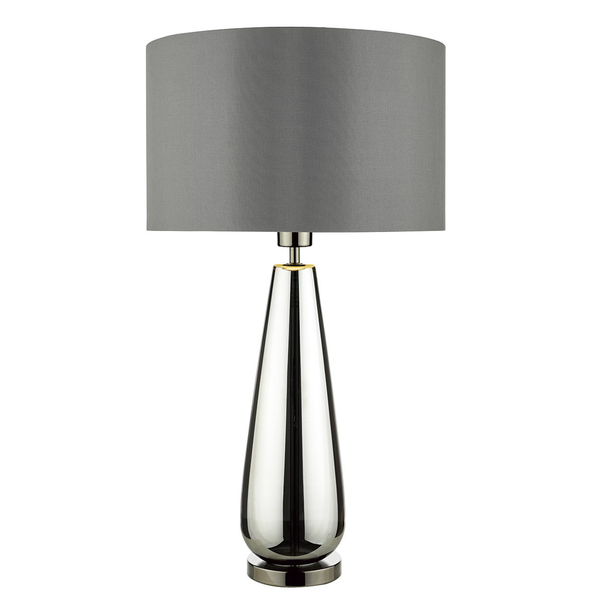 A modern and sleek table lamp with black chrome base, complete with a smoked grey shade. Operated by an in-line rocker switch.