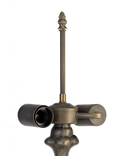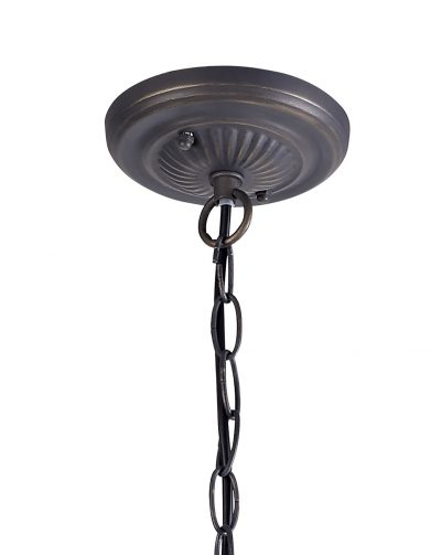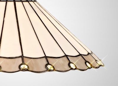 Paragon uses a traditional Tiffany shade but with a modern twist. The fanned feather shapes forming the umbrella glass is mostly cream coloured with the curved tips of each point available in either green, brown, red, blue or grey. The modern component takes the form of small clear crystal pieces fixed on alternating points of the shades rim furthering the ranges regal appeal.