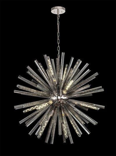 The Rigel Range presents intriguing glass shaped fittings that have been moulded to give a three dimensional triquetra. The glass rods on this range enhances the overall intriguing optical effect of the fittings and these can be further elevated by using modern LED light bulbs. The fixtures are available in a variety of finishes and sizes from semi-flush fittings to 32 light pendants. Each frame can be chosen with either a brown oxide, polished nickel or matt black frame with either clear, champagne gold or smoke glass.