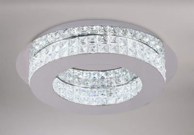 This stunning flush crystal ceiling light partners high quality clear crystal squares with a highly polished chrome finish to provide an enticing modern fitting. The light given from the integral 4000K LED’s refracts through the crystals producing subtle spectral ambience. The illumination is further amplified by the reflective mirror plate in the centre of the halo ring form of the framework. Rita is the ideal accompaniment to any stylish low ceiling living setting.