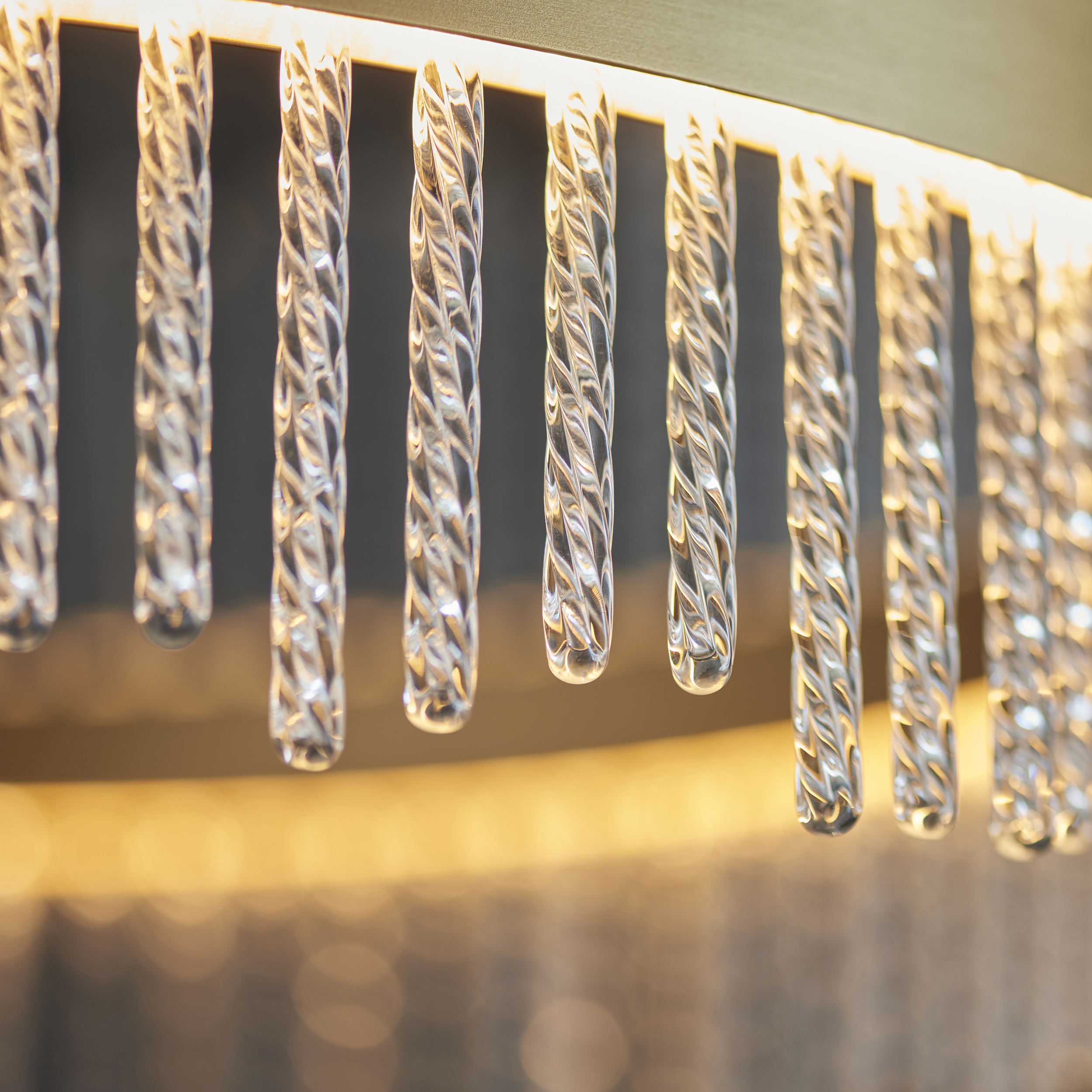 Scintilla is an effortlessly sleek ring style pendant finished beautifully in a modern brushed gold finish. The pendant adds visual interest via the twisted glass rods that are illuminated by the carefully positioned LED array.