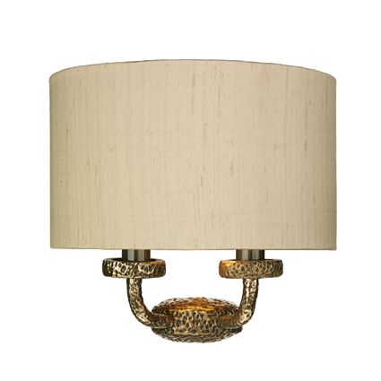 A stylish wall washer featuring textured frame in a bronze finish, complete with 100% silk shade in taupe.