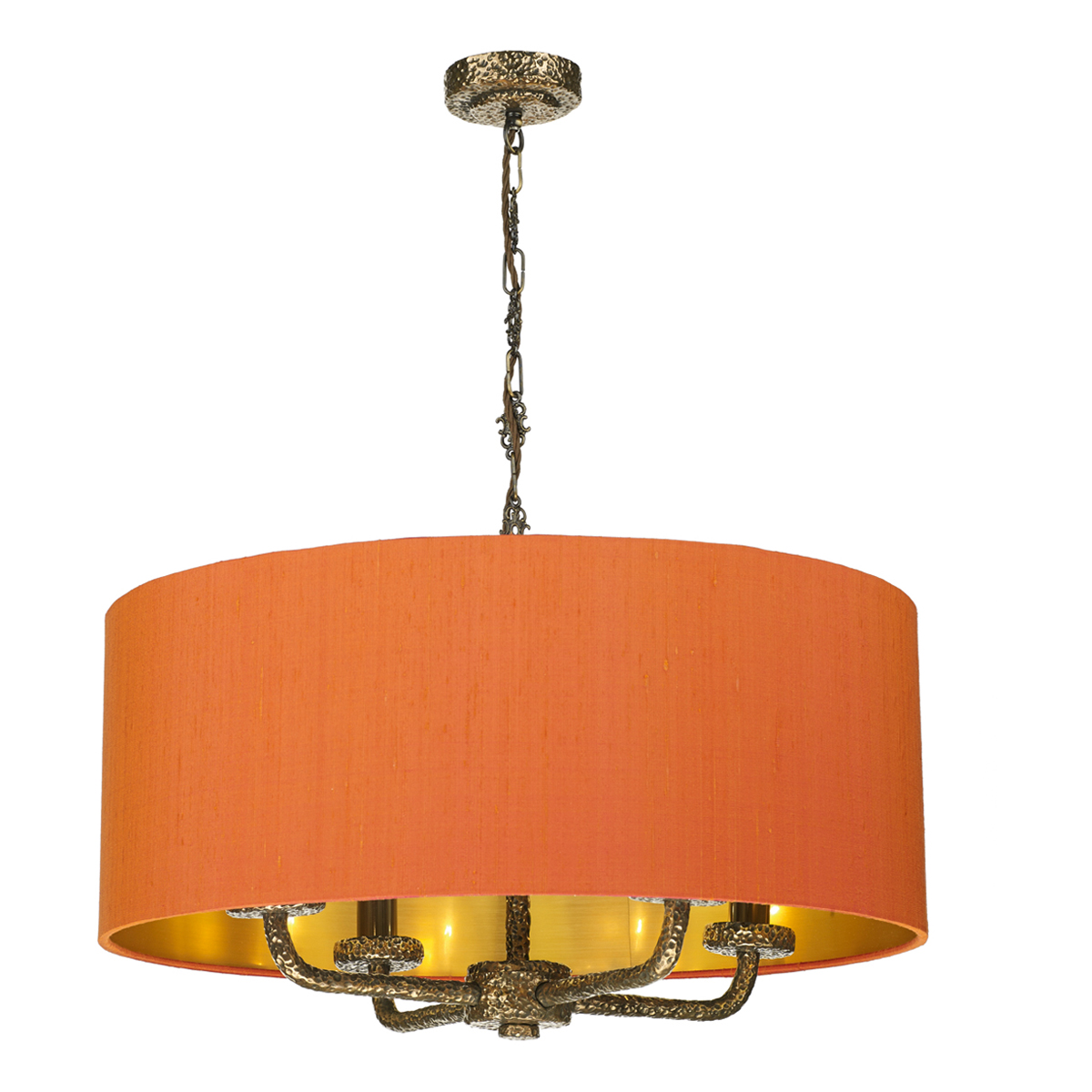 A stylish 4 light pendant featuring textured frame in a bronze finish, complete with 100% silk shade in firefly orange with gold laminate lining.