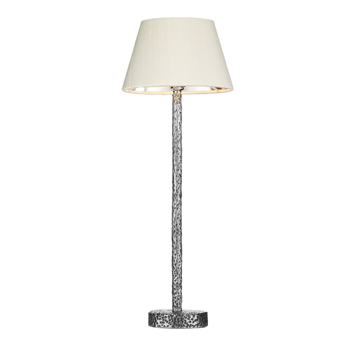 A dainty table lamp featuring textured base in a pewter finish. Base only, shade can be ordered separately. Operated by a push bar switch. Also available in bronze.