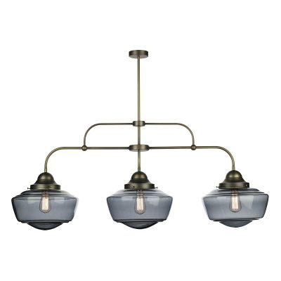 A modern industrial style 3 light pendant, featuring antique brass metal work and smoked glass shades. Can be manufactured to a height which suits any space, made in the UK. Also available with opal glass shades. A single pendant is also available in this range.