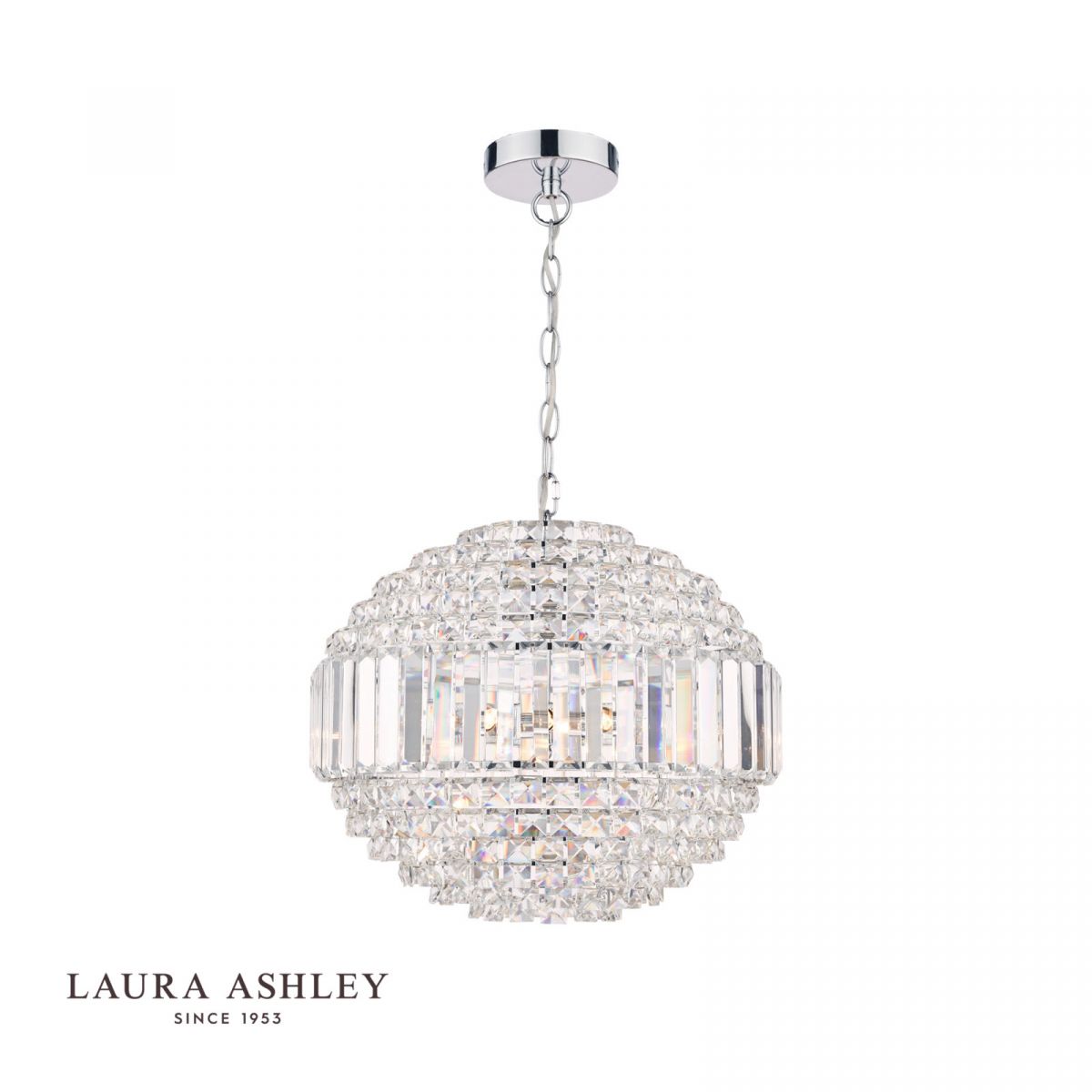 The glamorous Laura Ashley 5 light Vienna globe ceiling light has added magnificence, thanks to its proportions, and is guaranteed to be a striking focal point in your home. This luxurious statement light features a belt of bevelled glass ‘coffin crystal’ rods accompanied by a glittering globe of square-cut faceted glass droplets, all suspended from circular frames in a bright, polished chrome finish.