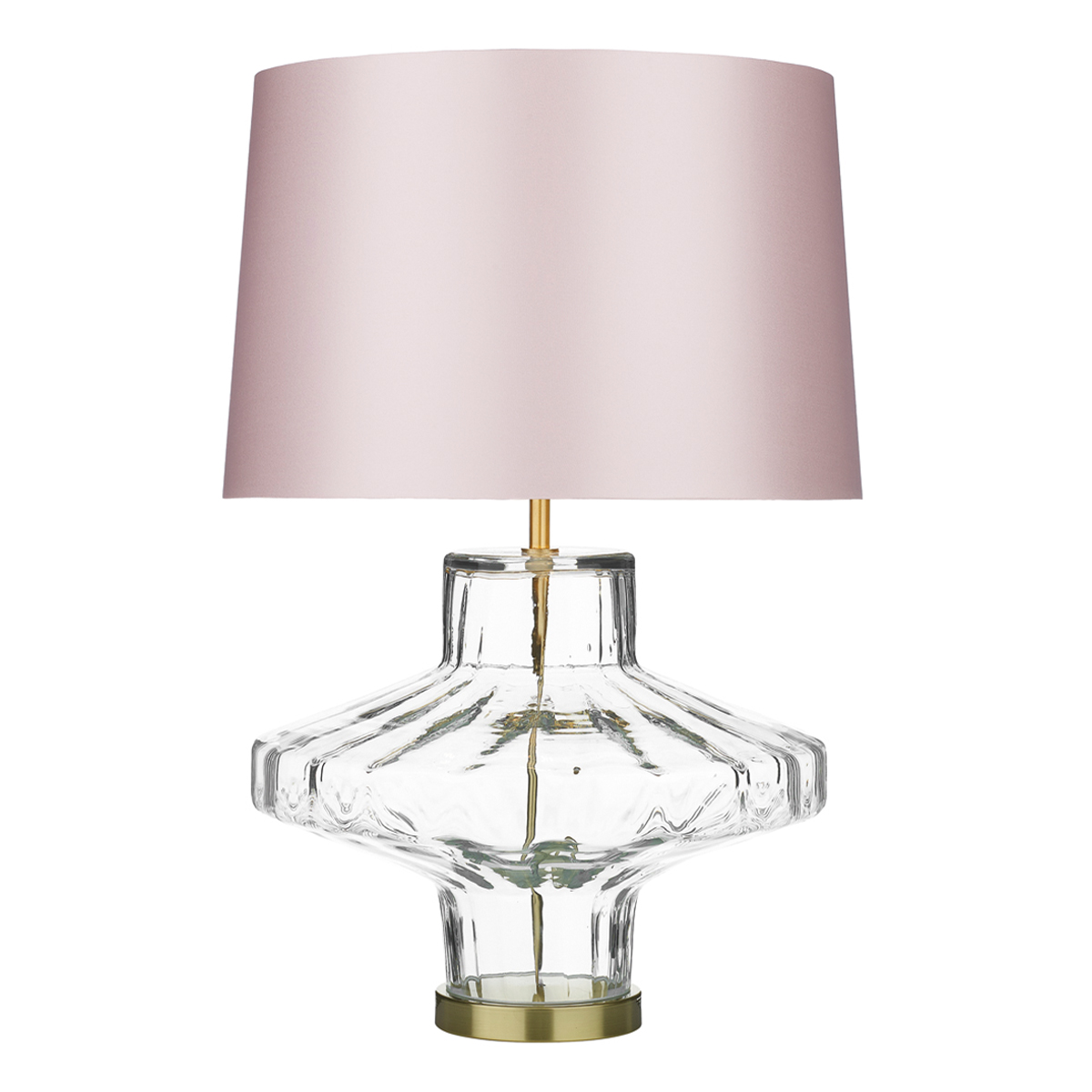 A delicate clear glass table lamp base, with antique brass detailing. Operated by an in-line rocker switch. Base only, shade can be ordered separately. Also available in pink glass.